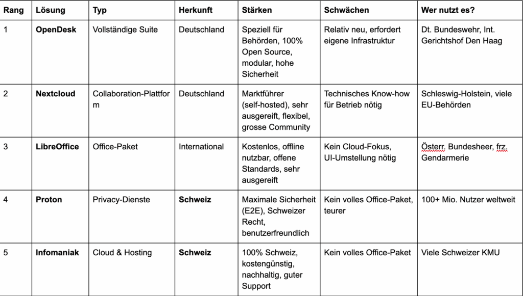Diese Rangliste basiert auf einer Kombination aus Funktionsumfang, Sicherheit, Souveränität, Verbreitung und nachgewiesenem Erfolg in der Praxis.