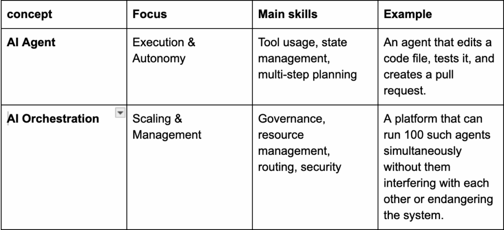 - AI Orchestration:This is the infrastructure that manages an entire army of agents. It handles security (sandboxing), resource allocation (computing power, API limits), and task distribution to the right agent. Orchestration becomes crucial when scaling from a single agent on a laptop to hundreds of agents in the cloud.